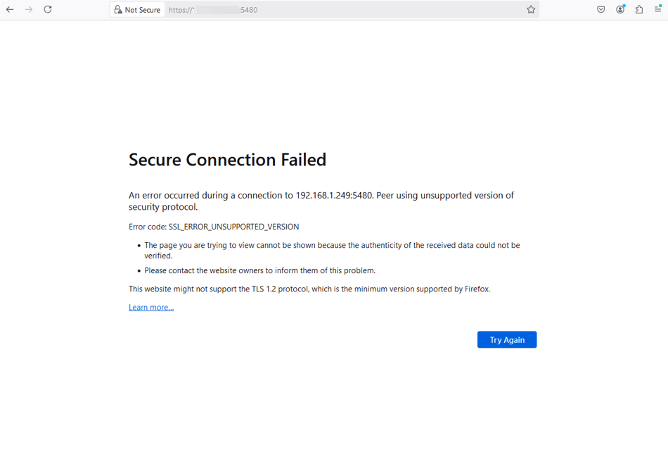 Após a instalação é preciso acessar a console pelo navegador, exibindo o erro: SSL_ERROR_UNSUPPORTED_VERSION, ou seja o navegador não tem mais suporte ao TLS 1.2.
