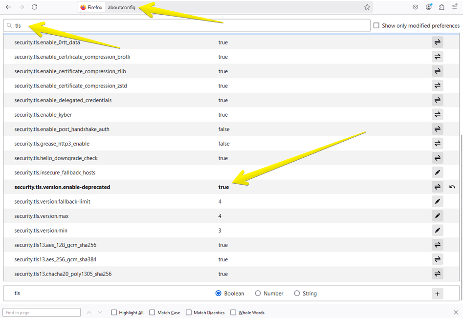 – Na opção security.tls.version.enable-deprecated altere para true;